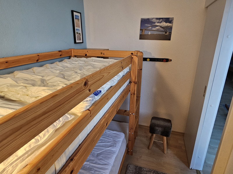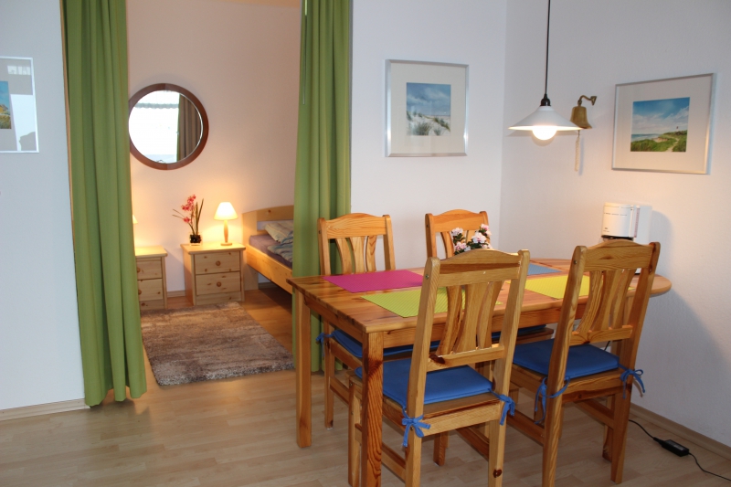 Die Ferienwohnung ist geeignet für zwei Erwachsene und zwei Kinder und hat eine Fläche von ungefähr 45 Quadratmeter. Sie ist aufgeteilt in Eingangsflur mit Wandschrank und Garderobe, Wohn-Esszimmer, Elternschlafbereich mit zwei Einzelbetten, Kinderzimmer mit Etagenbett sowie Bad mit WC und Dusche.