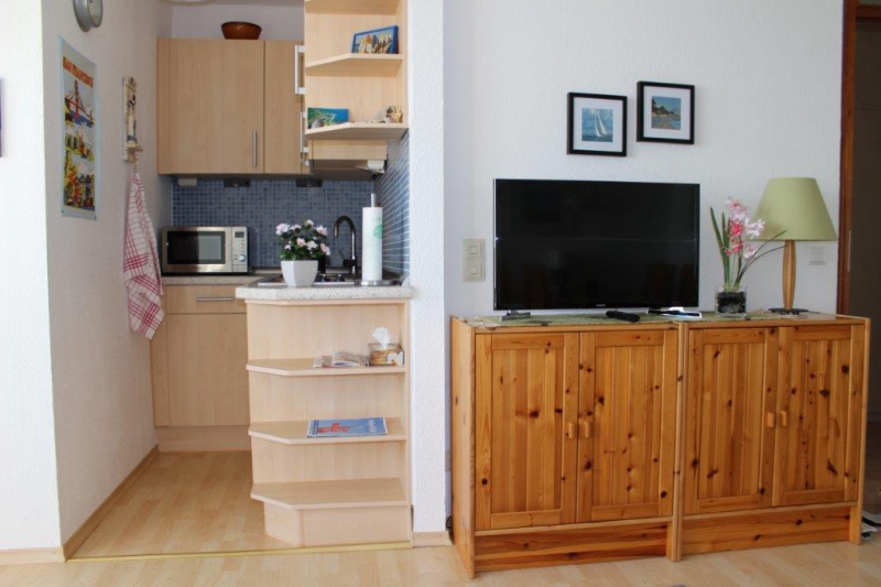 Die Küchenecke ist komplett eingerichtet mit einem 4-Zonen-Induktionskochfeld, einer Mikrowellen-Backofenkombination, Kühlschrank mit Gefrierfach, Kaffeemaschine, Wasserkocher, Toaster, Waffeleisen und Raclette-Grill. Im Wohnbereich befinden sich ein LED-Fernseher (Smart TV) und ein Digital-Radio mit Bluetooth-Funktion. Unsere Gäste können in der Wohnung kostenloses WLAN nutzen.